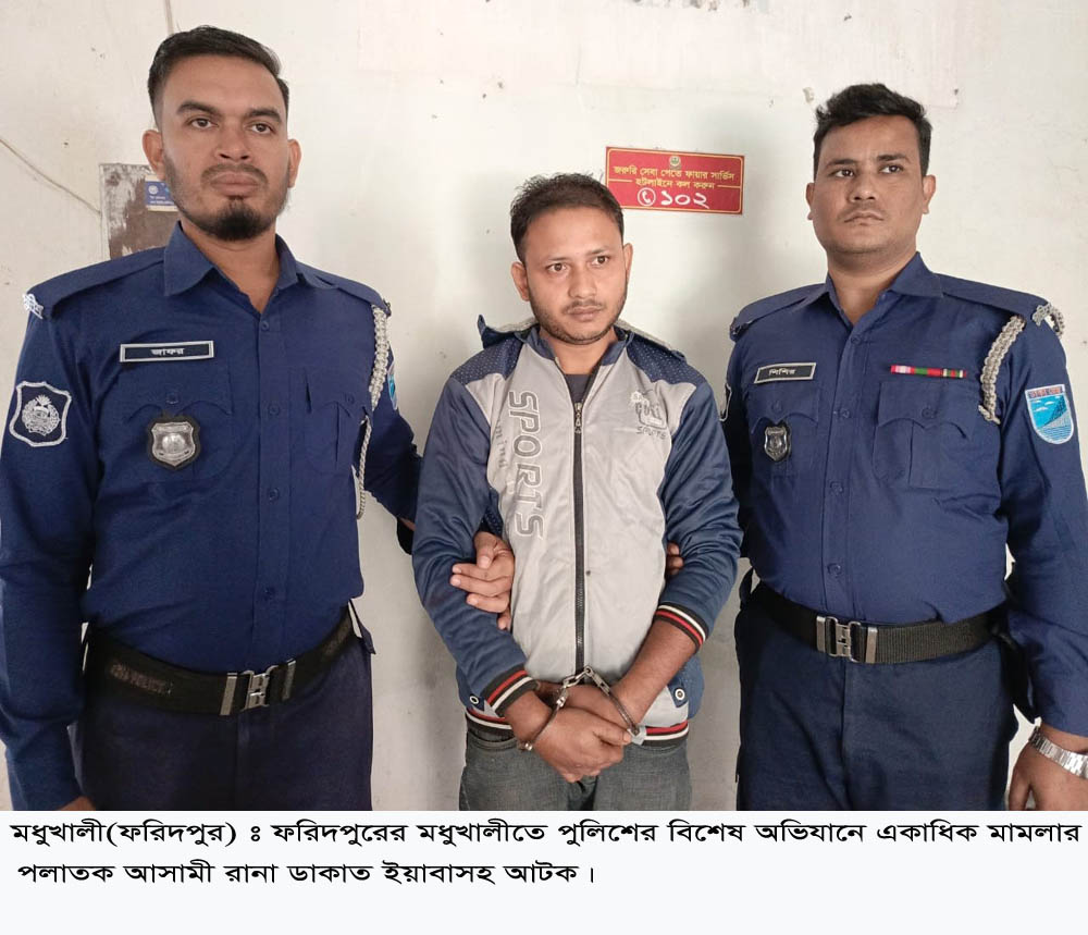 মফিজুর রহমান মুবিন : ফরিদপুরের মধুখালীতে কুখ্যাত ডাকাত ও একাধিক মামলার পলাতক আসামি মোঃ রানা (২৬) কে মাদকসহ গ্রেফতার করেছে মধুখালী থানা পুলিশ। শনিবার (১৫ নভেম্বর) সন্ধ্যায় গোপন সংবাদের ভিত্তিতে আড়পাড়া ইউনিয়নের আর পাড়া গ্রামে বিশেষ অভিযান চালিয়ে তাকে আটক করা হয়। গ্রেফতারকৃত রানা একই গ্রামের রফিকুল ইসলামের ছেলে। এলাকায় বিস্তারিত