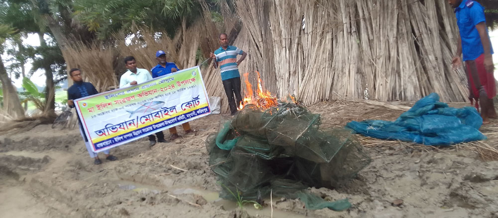 মধুখালীতে নিষিদ্ধ চায়না দুয়ারি জাল পুড়িয়ে ধ্বংস