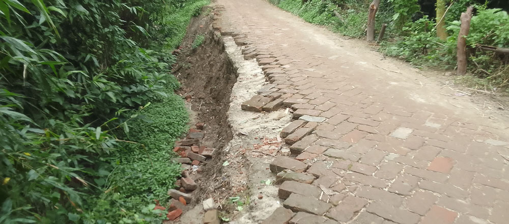 ফরিদপুরের মধুখালী উপজেলার ডুমাইন ইউনিয়নের বটপাড়া খালের পাড়ের ইটের সলিং রাস্তায় খালের পাড়ে মাটি কম থাকার কারনে এবং ভারি বৃস্টির কারনে তিনটি স্পটের ইটের রাস্তাটি খানাখন্দে এবং ধসে বেহাল দশা হয়ে পড়েছে। এ যেন দেখার কেউ নেই। বর্তমানে রাস্তাটির বেহাল দশা হওয়ায় চলাচলের অনুপযোগী হয়ে পড়েছে। ফলে জন সাধরণের দুর্ভোগের সীমা নেই। এদিকে রাস্তাটির বেহাল হওয়ায় প্রতিনিয়ত নানা সমস্যায় পড়তে হচ্ছে পথচারীদের। সরেজমিনে দেখা যায়, উপজেলার ডুমাইন ইউনিয়নের বটপাড়া ব্রীজ থেকে একটু উত্তরে গেলেই হরিপদ খালের ব্রীজ পর্যন্ত তিনটি স্পটে ইটের সলিং এর রাস্তাটির জায়গায় জায়গায় ভাঙ্গা ও ধ্বষে গেছে। অল্প বৃষ্টি হলেই রাস্তায় খানাখন্দে পানি বেঁধে যাচ্ছে। বটপাড়া গ্রামের একাধিক ব্যক্তি প্রতিনিধিকে জানান, ভাঙ্গা ও ধ্বষে যাওয়া রাস্তায় মোটরসাইকেল ও বাইসাইকেল, ভ্যান, গরুর গাড়ী, নছিমন , করিমন নিয়ে চালিয়ে যাওয়াও ঝুঁকিপূর্ণ হয়ে পড়েছে। আর রাতে অন্ধকারে আরও বেশী সমস্যা । তাছাড়া ফুলেরশ্বরী নদী ও ডুমাইন রুপাতলা বিলের ও অন্যান্য মাঠের ক্ষেত খামার আনার এবং আশপাশের গ্রামের জরসাধারণের চলাচলে এই রাস্তাটিই ভরসা। এছাড়া কোনো অসুস্থ রোগী নিয়ে রাস্তাটি দিয়ে যেতে পারে না। ৫ থেকে ১০টি গ্রামের মানুষ যাতায়াত করে এ রাস্তা দিয়ে।এছাড়াও রাস্তা খারাপের কারণে শিক্ষার্থীদের স্কুল কলেজে যাওয়া আসার সময় চরম দুর্ভোগ পোহাতে হয়। রাস্তাটি এখন পিচ করনের সময় দাবি হয়ে উঠেছে। এলাকাবাসি দ্রুত সংস্কার দেখতে চায়। এই ইটের রাস্তার জন্য প্রতিনিয়ত নানা সমস্যায় পড়তে হয়। গত ২—৩ বছর আগে এ খালের পাড়ের কাঁচা রাস্তায় ইট বসানো হয়। তার পর আর রাস্তাটি সংস্কার বা পাকা করা হয়নি। এ ব্যাপারে স্থানীয় ইউপি সদস্য জীবন কুমার মন্ডল বলেন, রাস্তা খারাপ মানুষের চলাচলের সমস্যার সীমা নেই। তবে খালের পাড়ের ছলপ কাটার কারনে এবং অতিরিক্ত বৃস্টির কারনে এই ইটের সলিং রাস্তা মাঝে মাঝে ধসে গেছে, মাঝে মধ্যেই পথচারীরা দুর্ঘটনার স্বীকার হচ্ছে যাহা মেরামত করা অতি জরুরী । এ বিষয়ে ডুমাইন ইউনিয়নের ভারপ্রাপ্ত চেয়ারম্যান আমিরুল ইসলাম বলেন কতৃপক্ষকে জানিয়ে উপজেলার ডুমাইন ইউনিয়নের বটপাড়া ব্রীজ থেকে একটু উত্তরে গেলেই হরিপদ খালের ব্রীজ পর্যন্ত তিনটি স্পটে ইটের সলিং এর বেহাল দশায় এ রাস্তাটি জনগনের চরম ভোগান্তির কথা চিন্তা করে অতি দ্রুতই পুনরায় সংস্কার করা প্রয়োজন বলে মনে করেন ।