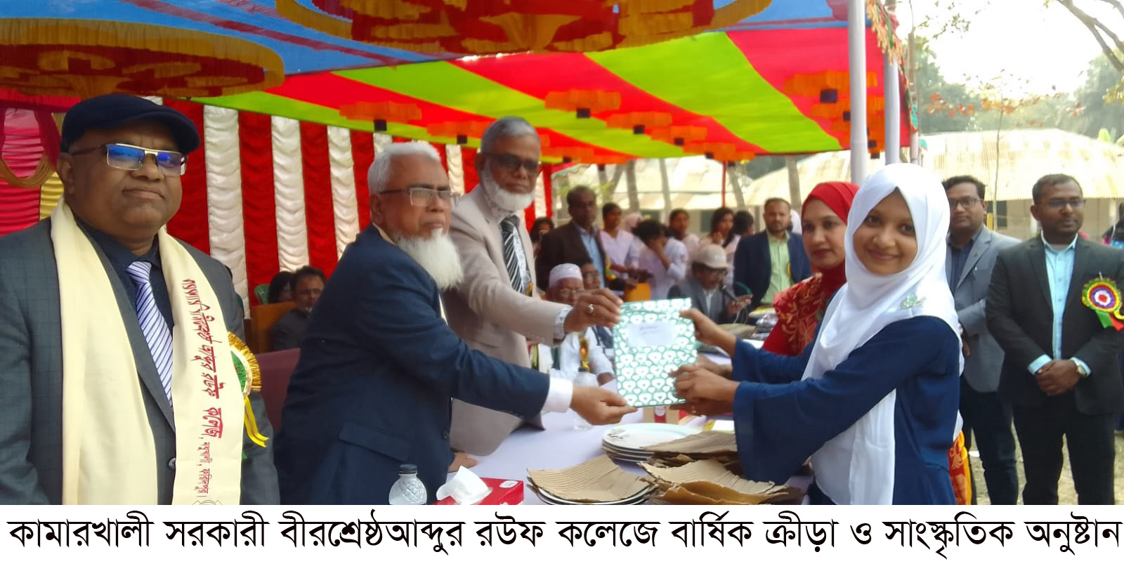 ফরিদপুরের মধুখালী উপজেলার কামারখালী সরকারী বীরশ্রেষ্ঠ আব্দুর রউফ কলেজে মঙ্গলবার দিনব্যাপী বার্ষিক ক্রীড়া ও সাংস্কৃতিক প্রতিযোগিতায় বিজয়ীদের মধ্যে পুরুস্কার বিতরণ করা হয়েছে। কলেজ পরিচালনা পরিযদ এর সভাপতি ও অধ্যক্ষ প্রফেসর এ.বি.এম. সাইফুর রহমান এর সভাপতিত্বে ক্রীড়া ও সাংস্কৃতিক অনুষ্টানে পুরস্কার বিতরণ সভায় প্রধান অতিথির বক্তব্য রাখেন ফরিদপুর সরকারী রাজেন্দ্র কলেজের অধ্যক্ষ প্রফেসর এস.এম. আবদুল হালিম। স্বাগত বক্তব্য রাখেন অত্র কলেজের অধ্যক্ষ প্রফেসর এ.বি. এম . সাইফুর রহমান । বিশেষ অতিথির বক্তব্য রাখেন সরকারী আইন উদ্দীন কলেজের অধ্যক্ষ প্রফেসর নাজমুল হক, কামারখালী ইউনিয়নের চেয়ারম্যান ও মধুখালী উপজেলা বিএনপি সভাপতি রাকিব হোসেন চৌধুরী ইরান। এ ছাড়া বিশেষ অতিথি হিসেবে উপস্থিত ছিলেন মধুখালী সরকারী আইন উদ্দীন কলেজের সহকারী প্রফেসর ডাঃ মোহাম্মাদ আবু সালেহ, শহীদ বীরশ্রেষ্ঠ মুন্সী আব্দুর রউফ এর বড়বোন জোহরা খাতুন, কামারখালী সরকারী বীরশ্রেষ্ঠ আব্দুর কলেজের প্রতিষ্ঠাতা সদস্য ও কামারখালী বাজার বণিক সমিতির সভাপতি বীরমুক্তিযোদ্ধা কাজী মতিউল ইসলাম মুরাদ, কামারখালী যুবক সমিতির ১নং সহ—সভাপতি আজাহারুল ইসলাম, গন্ধখালী সরকারী প্রাথমিক বিদ্যালয়ের সাবেক প্রধান শিক্ষক ও কলেজ প্রতিষ্ঠাতা সদস্য মুজিবর রহমান, বীরমুক্তিযোদ্ধা আঃ রাজ্জাক মৃধা. সাবেক প্রফেসর মির্জা গোলাম ফারুক, কামারখালী ইউনিয়ন বিএনপি সভাপতি আক্কাচ আলী মৃধা,আড়পাড়া ইউনিয়নের সমাজসেবক ইফতেখারুজ্জামান নিক্সন, আড়পাড়া ইউনিয়নের কৃতি সন্তান ও বামুন্দি বালিয়াকান্দি উচ্চ বিদ্যালয়ের সহকারী প্রধান শিক্ষক নজরুল ইসলাম শিকদার . কামারখালী বাজার বিশিষ্ঠ ব্যবসায়ী ও জামায়াতে ইসলামীর নেতা রমজান আলী শেখ, আড়পাড়া জামায়াতে ইসলামীর সাধারন সম্পাদক ও আড়পাড়া —কামারখালী কাজী সিরাজুল ইসলাম গার্লস স্কুল এন্ড কলেজের অধ্যক্ষ মোল্লা আবু সাঈদ, আড়পাড়া বিএনপি নেতা তোফাজ্জ্বেল হোসেন মন্ডল ফেলু, কামারখালী ইউনিয়ন বিএনপি নেতা মিজানুর রহমান মুরাদ প্রমুখ। অনুষ্টান সঞ্চালনায় ছিলেন কাজী আমিনুল ইসলাম। সাংস্কৃতিক ও ক্রীড়া অনুষ্টানের আহবায়ক ছিলেন প্রভাষক হাফিজুর রহমান ও প্রভাষক এম কলিম উল্লাহ। সার্বিক তত্ত্বাবাধনে ছিলেন কলেজ পরিচালনা পর্ষদের সাধারন সম্পাদক নাজমুল হক আকন্দ সহ আরো অনেকে। ক্রীড়া পরিচালনায় ছিলেন এনামূল হক শিকদার সহ আরো অনেকে । আপ্যায়নে ছিলেন নৃপল কুমার সাহা ও জাহিদুল ইসলাম সহ আরো অনেকে। সবশেষে সভাপতি ও অধ্যক্ষ প্রফেসর এ.বি.এম সাইফুর রহমান সবার উদ্দেশ্যে গুরুত্বপূর্ন কথাবাত্রা বলে অনুষ্টান শেষ করেন।