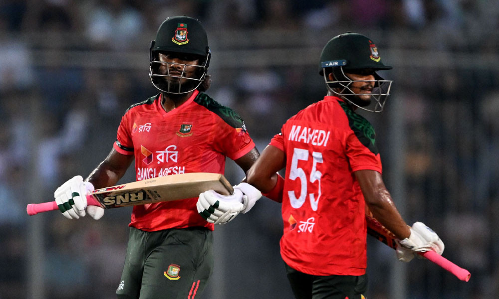 দলকে সামনে থেকে নেতৃত্ব দেওয়ার বিপরীতে ব্যক্তিগত ৮ রানে ফেরেন বাংলাদেশের অধিনায়ক। দলীয় ২৫ রানেই ফেরেন তাওহিদ হৃদয়ও। রানের খাতা খোলার আগে প্রান্ত বদল করতে গিয়ে রান আউটের ফাঁদে পড়েন তিনি।
