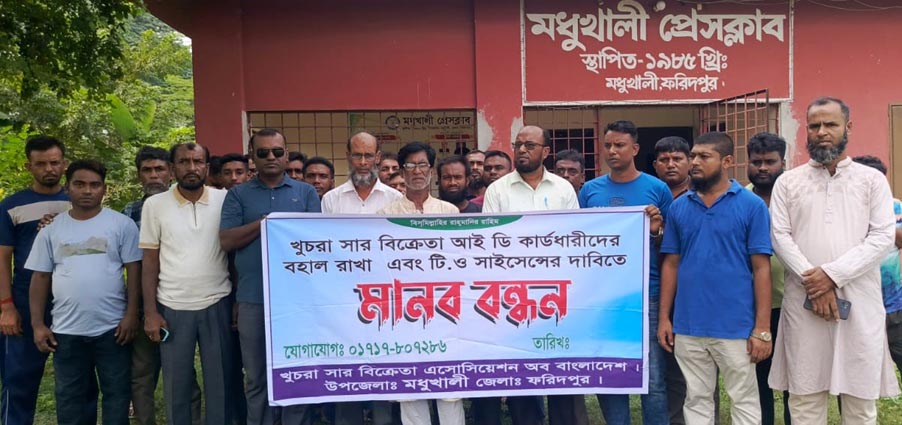 লাইসেন্স বাতিল প্রক্রিয়া স্থগিতের দাবিতে মধুখালীতে সার বিক্রেতাদের মানববন্ধন ও স্মারকলিপি প্রদান