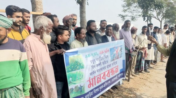 বোয়ালমারীতে ফসলি জমিতে চারকোল পাউডার কারখানা নির্মান প্রতিবাদে মানববন্ধন চাষীদের