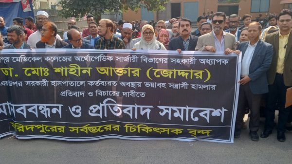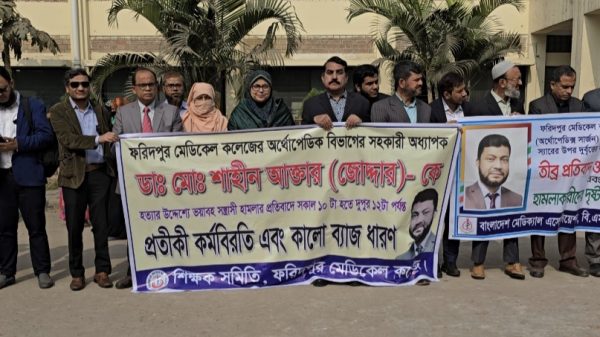ফরিদপুর মেডিকেলে চিকিৎসকের ওপর হামলার ঘটনায় বিচারের দাবিতে চিকিৎসকদের কর্মবিরতি, কালোব্যাজ ধারন ও মানববন্ধন