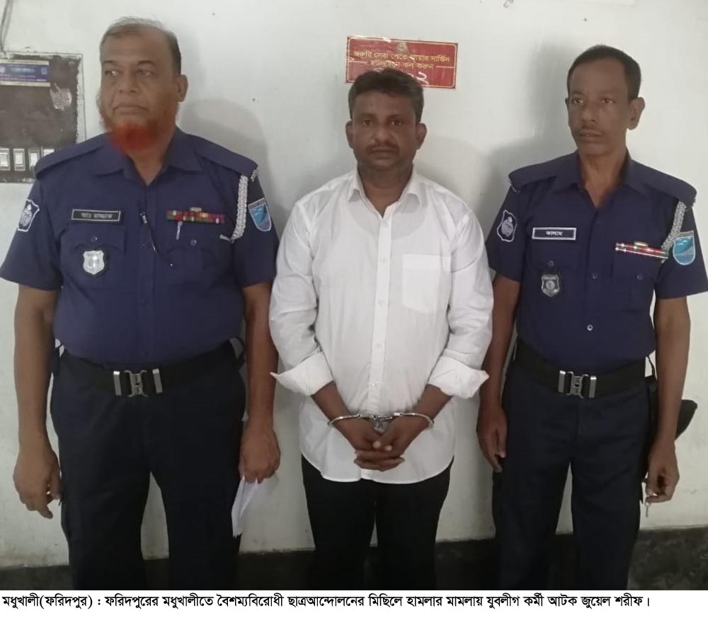 মধুখালী(ফরিদপুর)প্রতিনিধি : ফরিদপুরের মধুখালীতে বৈষম্যবিরোধী ছাত্র আন্দোলনের মিছিলে হামলা মামলার এজাহার নামীয় আসামী ও যুবলীগ কর্মী জুয়েল শরীফকে আটক করেছে
