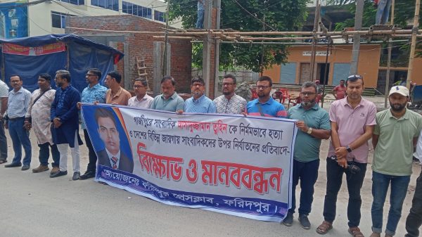 গাজীপুরের সাংবাদিক তুহিন হত্যার প্রতিবাদে ফরিদপুর প্রেসক্লাবের বিক্ষোভ ও মানববন্ধন