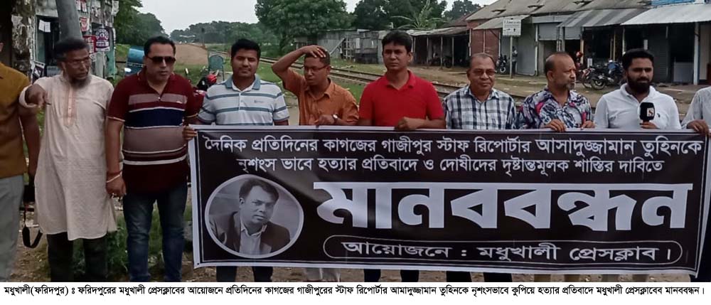 মধুখালী প্রেসক্লাবের আয়োজনে গাজীপুরে সাংবাদিক তুহিন হত্যার প্রতিবাদ ও বিচারের দাবীতে মানববন্ধন